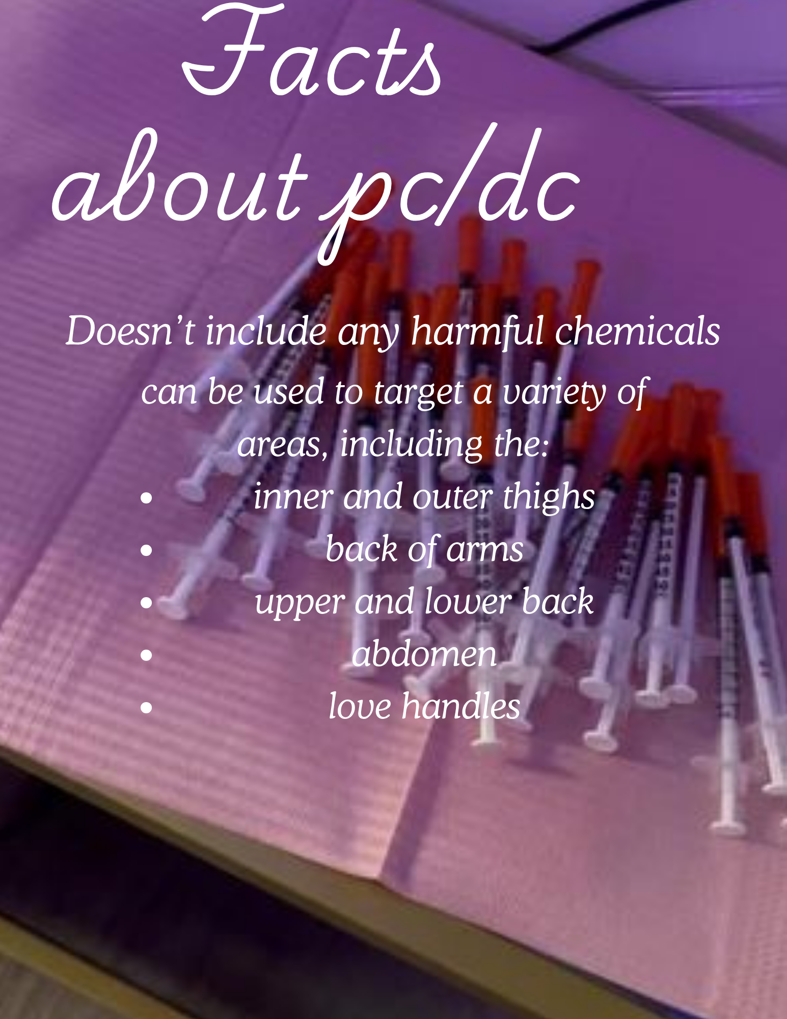PC/DC injections are a non-surgical body and facial contouring treatment designed to permanently dissolve stubborn pockets of fat that resist diet and exercise. This treatment works by breaking down fat cells, which are then naturally eliminated by the body, helping create a smoother, more sculpted appearance over time.